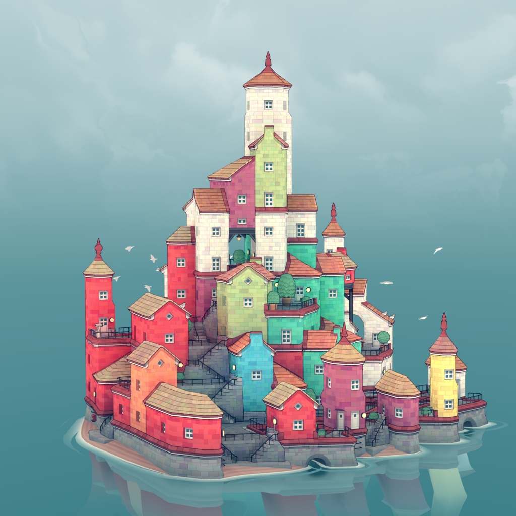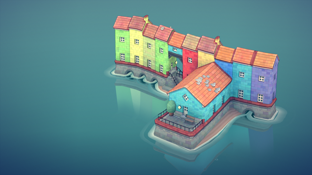 Townscaper is an experimental passion project. More of a toy than a game. Pick colors from the palette, plop down colored blocks of houses on the irregular grid, and watch Townscaper’s underlying algorithm automatically turn those blocks into cute little houses, arches, stairways, bridges, and lush backyards, depending on their configuration.
